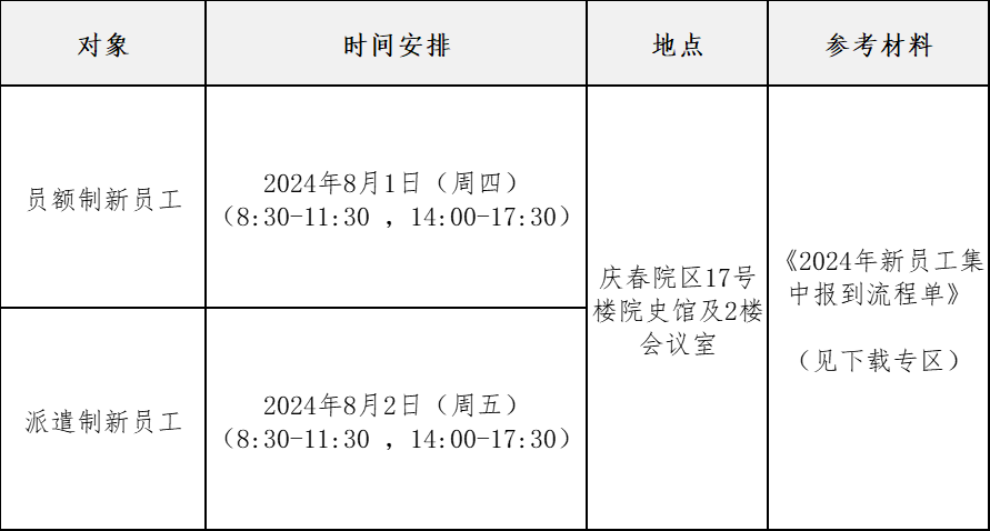②非应届生、海外及港澳台地区高校毕业生须携调档材料至我院办理调档手续,在职人员建议提前一个月办理好离职手续,以便预留充足时间办理调档(调档手续办理流程详见招聘官网-通知公告-下载专区《2024年新员工集中报到流程单》)。